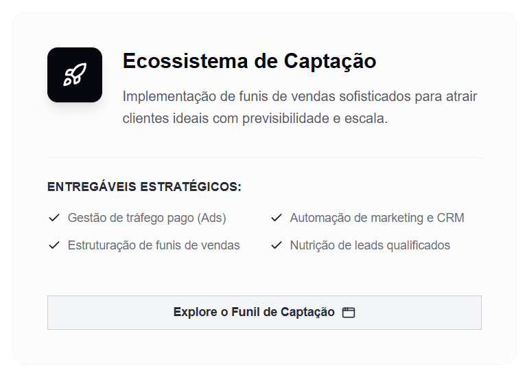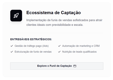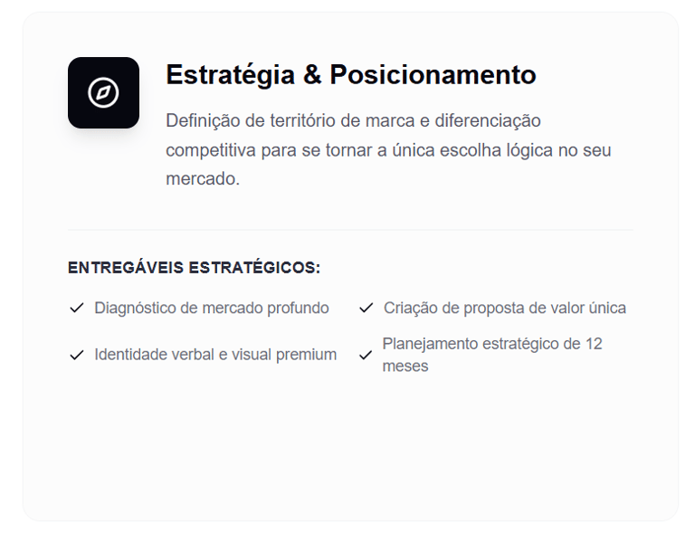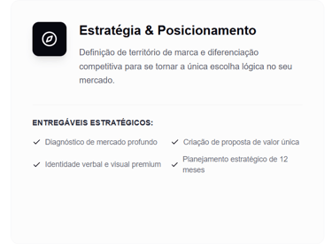 Nossos projetos são estruturados para empresas que entendem o valor da excelência. Trabalhamos com tickets que refletem a profundidade e o impacto da nossa entrega estratégica.